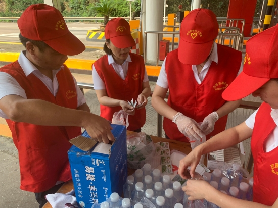 服務在崗,情系災區 ——臨海南收費所組織開展“獻愛心”活動 8月14日中午,臨海南收費所車道安全島內搭起臨時愛心服務臺,準備了禮品袋、礦泉水、風油精、人丹等物品,為過往司乘人員免費提供解暑用品。 高溫天氣中,該所員工身穿耀眼的“紅馬甲”,面帶微笑,顯得格外耀眼動人。