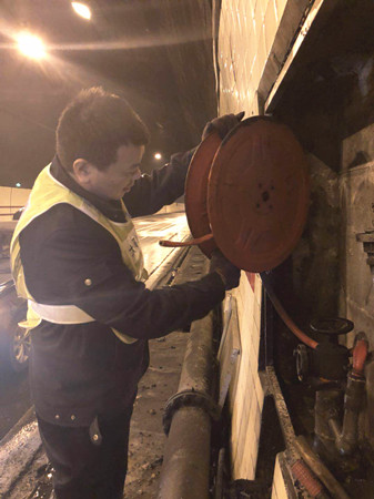 圖為檢查人員在檢查消防卷盤 大溪嶺隧道所負責人向來客介紹,隧道清洗工作需集團下屬的施救中心、維養中心、隧道所員工,以及外協單位、養護公司等人員的積極配合,分工合作,將利用兩天時間完成大溪嶺雙向隧道的清洗維修任務。張金財再次稱贊表示,控制隧道清洗時間能有效地緩解地方交通壓力、節能減排。 2018年度春運即將開始,各方檢查人員借此次隧道清洗機會,全面排查影響隧道暢通的安全隱患,做好隧道內設備設施的維修保養工作,為創造平安節日提供保障。 陳智慧