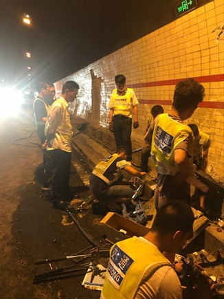 高壓電纜損壞,隧道停電,大溪嶺隧道所所長助理羅鳴春和執勤隊員李新波、王宇鵬火速參與搶修高壓電纜。7點43分,公司工程部機電維養中心當班人員與施工單位趕到事故現場,一邊清理一邊搶修。
