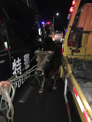 警報拉起,警燈閃爍,猛牛在施救車和巡邏車護送下,走過黃土嶺隧道,并在警車引導下,走向臺州收費所出口。晚7:00時在即將出口時,牛開始受驚,四處突圍,為避免事故,飛速趕過來的臺州110特警擊中了牛蹄,制伏了開始發瘋的牛。費了老大力氣,特警、交警及施救人員總算合力將牛抬上施救車安全帶下了高速公路 。 據悉,這起事件由于一輛運牛的貨車沒有做好安全措施,行駛過程中,牛逃下了車。所幸,處置到位,沒有釀成安全事故 。 鄭蔚