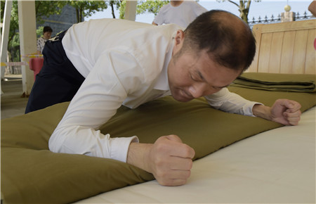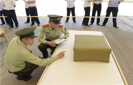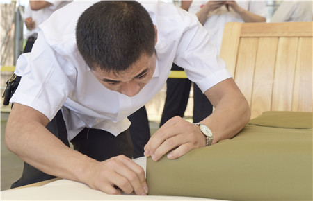 教官用手量量被子上下厚度,四周細(xì)細(xì)觀察,在兩床“豆腐塊”被子之間反復(fù)來回查看了幾遍,又與另一個(gè)教官指指點(diǎn)點(diǎn)商量了好久,不僅是參賽者,圍觀者都開始緊張了。確實(shí),按照內(nèi)務(wù)整理要求,這兩床已被疊成豆腐塊的被子折得有棱有角,被面光滑,上下勻稱,外行人看來就是一模一樣的完美,沒有任何區(qū)別了。“讓他們都晉級(jí)吧?!迸杂^者說。教官笑著搖搖頭,對(duì)大家解釋道:“3號(hào)床勝出,因?yàn)樗请p面折法,在規(guī)定時(shí)間內(nèi)兩面修整程度都一樣平整,這樣比起來,5號(hào)床稍遜一籌。”