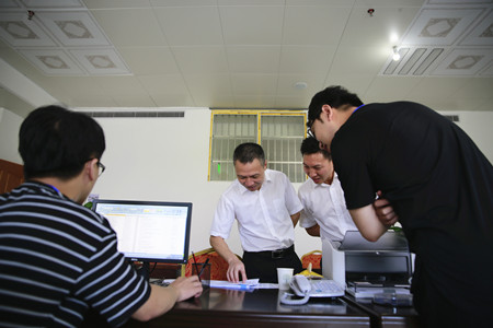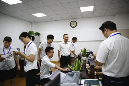 圖為集團(tuán)副董事長、總經(jīng)理張建平在臨海股權(quán)收購點檢查工作人員業(yè)務(wù)操作