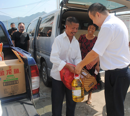 圖為臺州收費所黨支部書記王小勇給困難戶送上慰問品 潘山頭村共有22戶困難戶,因時間關(guān)系,臺州收費所黨支部一行走訪了其中3戶困難家庭,對于其他19戶困難家庭委托該村“兩委”領(lǐng)導(dǎo)代為慰問。每到一戶,支部書記王小勇都詳細詢問了解困難群眾的生活情況,勉勵他們積極面對生活,戰(zhàn)勝困難,同時為他們送去了中秋月餅、食用油、干果等慰問品及節(jié)日問候。