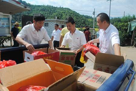 圖為臺州收費所黨支部人員正在搬下慰問品 在與村“兩委”領(lǐng)導(dǎo)親切座談時,慰問組一行對潘山頭村村容村貌有了新變化、村集體經(jīng)濟有了新發(fā)展表示由衷高興。村“兩委”領(lǐng)導(dǎo)對臺州高速公路集團公司多年來的支持、幫助深表感謝,并表示將繼續(xù)團結(jié)帶領(lǐng)廣大村民,共同把潘山頭村建設(shè)得更加和諧美好。