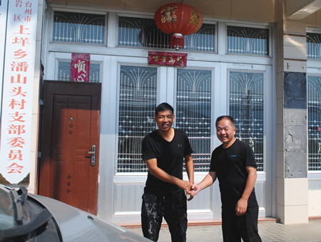 圖為公司黨群部負責(zé)人邵克與潘山頭村村長親切握手