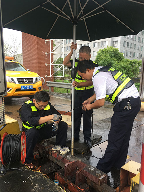 可是天公不作美,經(jīng)過一夜,雨還持續(xù)飄落著,收費站出口車輛逐漸增多,再不檢修將會導(dǎo)致其他車道通行壓力越來越大,可是如果冒雨檢修則有損壞設(shè)備的風(fēng)險。正在兩難之際,中心負責(zé)人葉俊向兄弟單位借來了一頂大型遮陽傘,在大傘遮擋下,搶修小組不顧前晚疲憊,對稱臺的4組傳感器用萬用表進行了一一檢測,結(jié)果顯示也全部正常。 “可為何組合起來傳輸?shù)教幚砥魃系臅r候計重數(shù)據(jù)就不正常了呢,難道問題出在這根數(shù)據(jù)線上?”順著這個思路,搶修人員慢慢地將這根線從線井中拉出,果不其然,在線的中間位置發(fā)現(xiàn)了被老鼠咬破的裂痕。為使數(shù)據(jù)傳輸更加穩(wěn)定可靠,搶修人員采用了整體更換方式,重新穿線再將兩頭的接點用電烙鐵進行焊接,經(jīng)過一個多小時地奮力搶修,稱臺故障終于排除,該車道也恢復(fù)正常通行。此時,搶修人員后背濕透,分不清是汗水還是雨水……