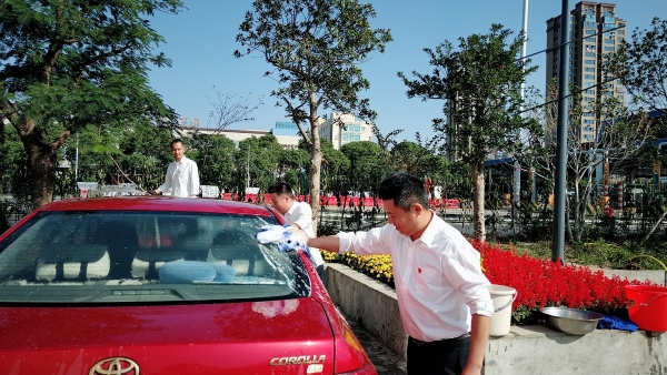 溫嶺西支部書記周超帶領黨員服務群眾 當天上午,活動一開始,前來洗車的車輛絡繹不絕。在支部書記周超的帶領下,五名黨員便開始分工合作。兩名男同志負責沖水、上泡沫、擦洗、再沖水,兩名女同志負責擦干和吸塵器清掃內室,還有一名男同志負責開車挪車,需要清洗的車輛一輛接著一輛,黨員同志們顧不得擦干身上的被水濺濕了的衣服,忙得不亦樂乎。看著被洗得一塵不染的車,大家都不約而同地會心一笑。