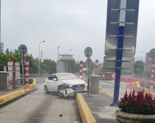 9月8日上午7點(diǎn)30分,一輛白色現(xiàn)代轎車在臺(tái)州收費(fèi)所出口準(zhǔn)備進(jìn)入ETC車道時(shí),突然撞向車道右側(cè)的全安島,在與安全島發(fā)生碰撞后,又一頭撞向了左側(cè)的安全島。 碰撞后的轎車半邊車身掛在了安全島上,車道上的光幕也因撞擊受損。收費(fèi)班長(zhǎng)在聽到一聲巨響后,第一時(shí)間跑上前去查看情況。因?yàn)閯×业淖矒?/span>,轎車的右側(cè)已經(jīng)在地上灑落一堆碎片。坐在副駕駛的女士從車上下來查看車況,隨后男司機(jī)也從另一邊打開車門下來。所幸撞擊并未造成人員受傷。班長(zhǎng)在確認(rèn)司機(jī)及乘客均無受傷后,一邊將事故報(bào)告監(jiān)控中心讓施救車輛前來救援,一邊提醒司機(jī)報(bào)警,人員站到安全島上方,不要隨意在車道上走動(dòng)。然后迅速跑到車道入口將水碼擋在車道口以防止有其他車輛誤入發(fā)生二次事故。