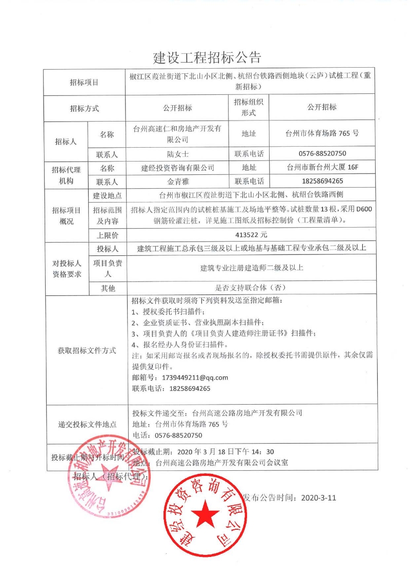 椒江區(qū)葭沚街道下北山小區(qū)北側(cè)、杭紹臺鐵路西側(cè)地塊(云廬)試樁工程(重新招標(biāo))公告
