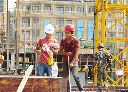 上圖為工人冒著高溫在文鼎苑工地上忙碌作業